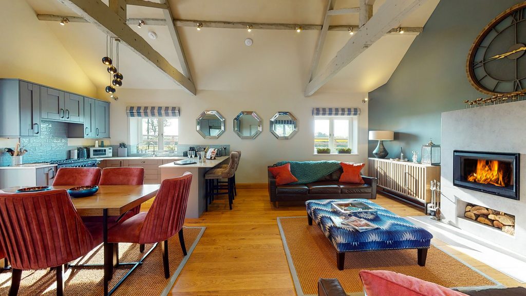 This stunning property enjoys an elevated position within sympathetically landscaped grounds and lovely views across the adjoining fields of Herefordshire countryside. This lovely cottage and barn conversion have been joined with a contemporary extension offering stunning rooms for your enjoyment. The ground floor has been cleverly designed and offers open-plan living that is perfect for families and friends wanting to spend time together. The living room area boasts cosy seating with an individually-designed wood burning stove – here you can relax in front of the TV beneath the beams in the vaulted ceiling. For dining, a table and chairs gives you space that is perfect for a supper of locally sourced produce. The kitchen is well-equipped with electric oven and gas hob, microwave, fridge/freezer, and dishwasher.